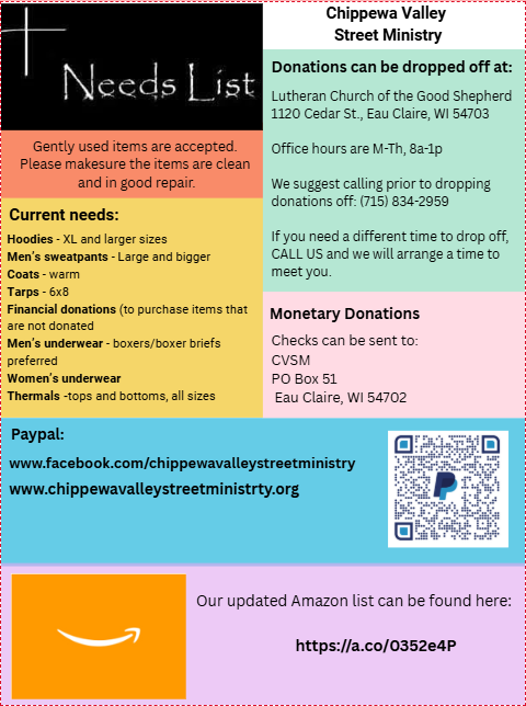 Deprecated: Methods with the same name as their class will not be constructors in a future version of PHP; plgSystemAddPrintStylesheet has a deprecated constructor in /home/djxcbosu/public_html/plugins/system/addprintstylesheet/addprintstylesheet.php on line 17 Chippewa Valley Street Ministry Needs List