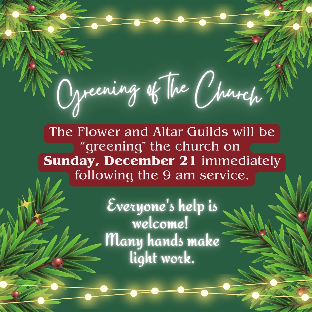 Volunteer at the Needful Things Pantry Saturday, Nov. 29th, 2:30-5:30 pm Calling All Kids! ~ December 3rd, 2025 33rd Annual ECW Cookie Walk ~ Sat. December 6th 33rd Annual ECW Cookie Walk Needs Bakers! Spread the Joy this Potluck Sunday! Join Us for Potluck Sunday ~ Dec. 14th Holiday Food Box Drive Greening the church on Sunday, December 21 Coffee Hour Needs Hosts! Sign up now to Host Coffee Hour ~ Join the Brew Crew In-person Worship this Sunday at 9am (Zoom & FB Live) Begin your day in prayer. Intercessions Follow Us on Social Media Kwik Trip Cards Fundraiser VANCO 2nd Sunday of Advent