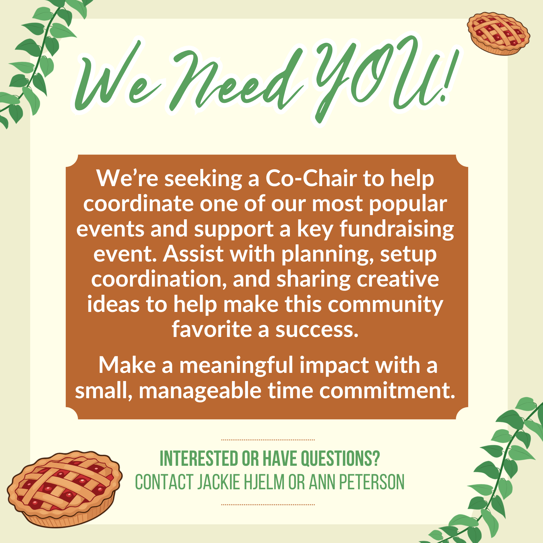 Deprecated: Methods with the same name as their class will not be constructors in a future version of PHP; plgSystemAddPrintStylesheet has a deprecated constructor in /home/djxcbosu/public_html/plugins/system/addprintstylesheet/addprintstylesheet.php on line 17 We need YOU! Sign up to be a Co-chair for the Plant, Pie & Ice Cream Social